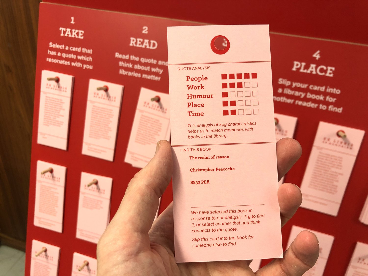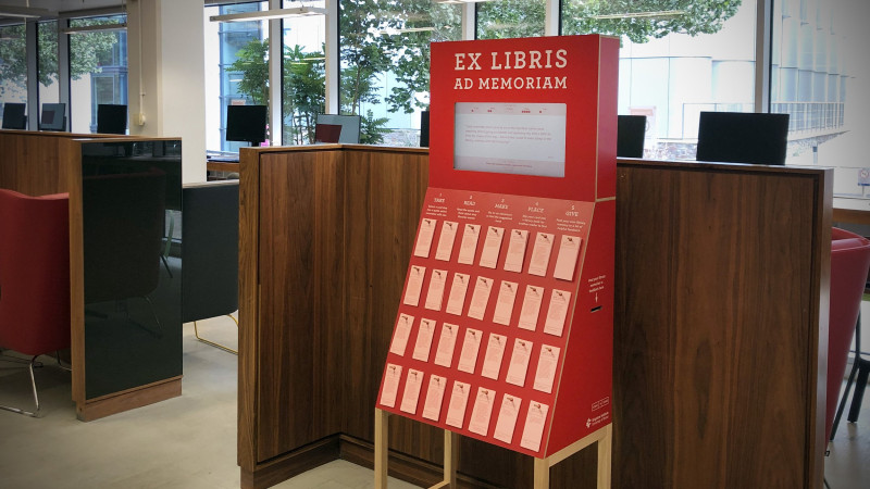 Ex Libris Ad Memoriam playfully shares quotes from oral history interviews and invites visitors to search for an associated book amongst the shelves of the Arts and Social Sciences library at the University of Bristol" (Stand & Stare)